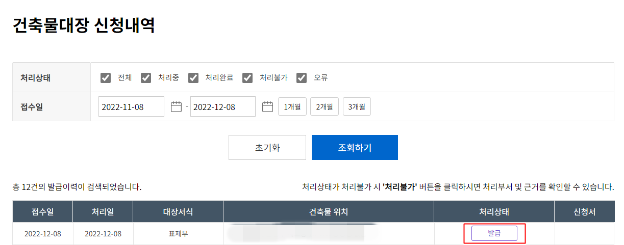 - 신청할 민원 담기 버튼 누르고 해당 목적물 건축물대장 열람하기.