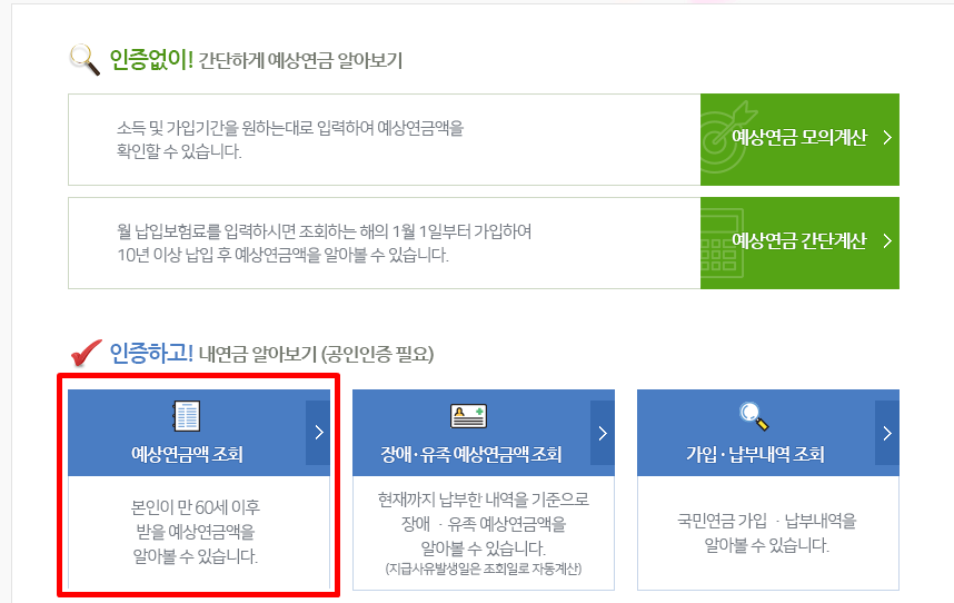 2. 예상연금액 조회 클릭 후 인증서 로그인한다. 카카오톡이나 간편 인증서 로그인 가능.