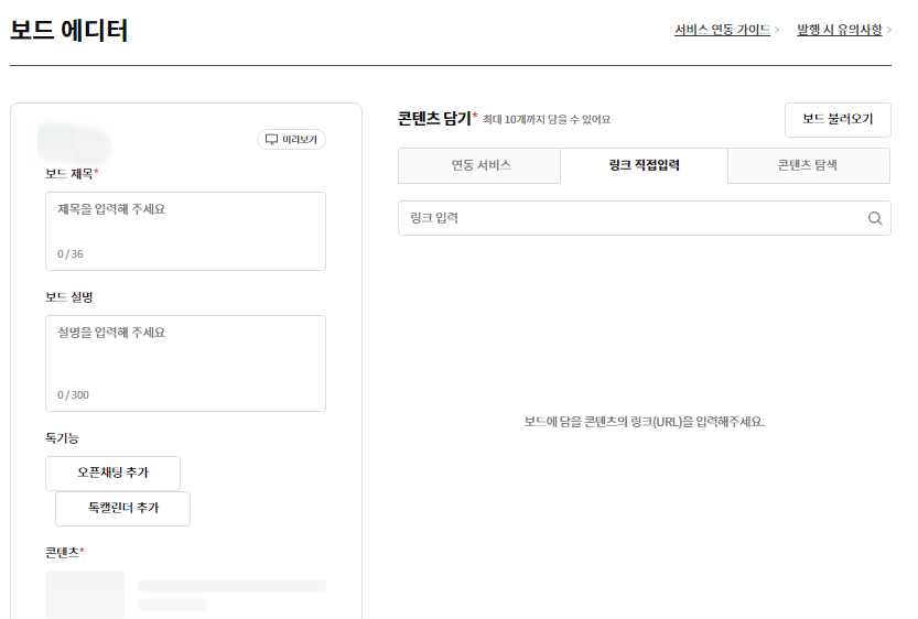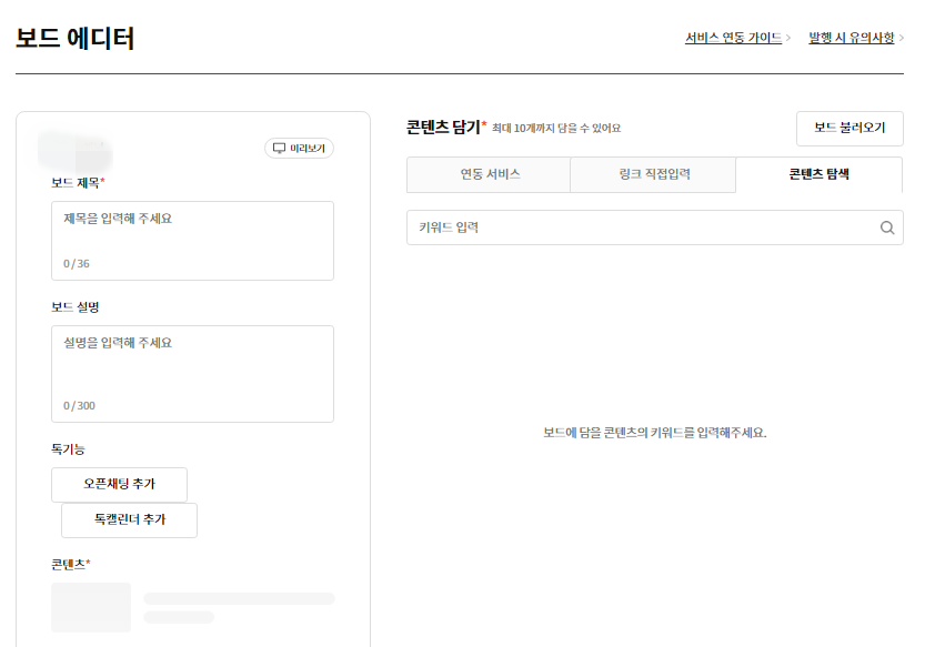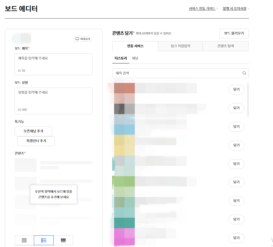 오른쪽에 보면 보드발행 하기를 누르면 보드발행 화면이 나옵니다. 보드의 제목을 넣고 보드 설명에는 내 올린 내용의 간략하게 적어주시면 됩니다. 왼쪽 화면을 보면 연동 서비스 카테고리가 있는데 내 채널에 티스토리 블로그, 인스타그램 등 연동하는 서비스가 있으면 밑에 내가 올린 콘텐츠들이 보이게 됩니다. 그리고 옆에 링크 직접입력 창에는 내가 본 뉴스나 유튜브 등 URL주소를 복사를 하고 붙여 넣기 하시면 보드가 올라가게 됩니다. 마지막으로 콘텐츠 탐색은 검색란에 내가 찾고 싶은 내용을 적으면 해당 뉴스나 동영상이 나오게 되는데 선택하여 담기를 누르면 보드를 발행할 수 있게 됩니다.