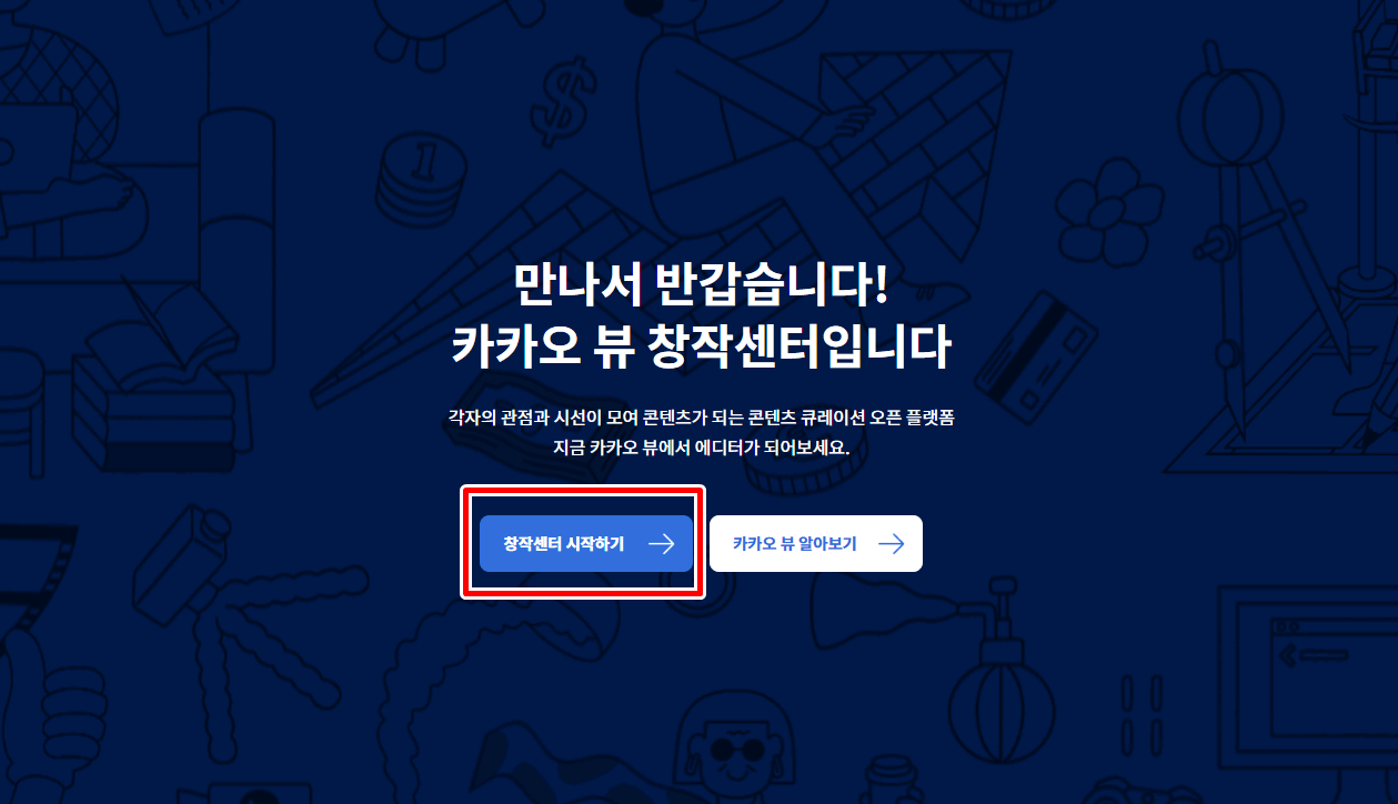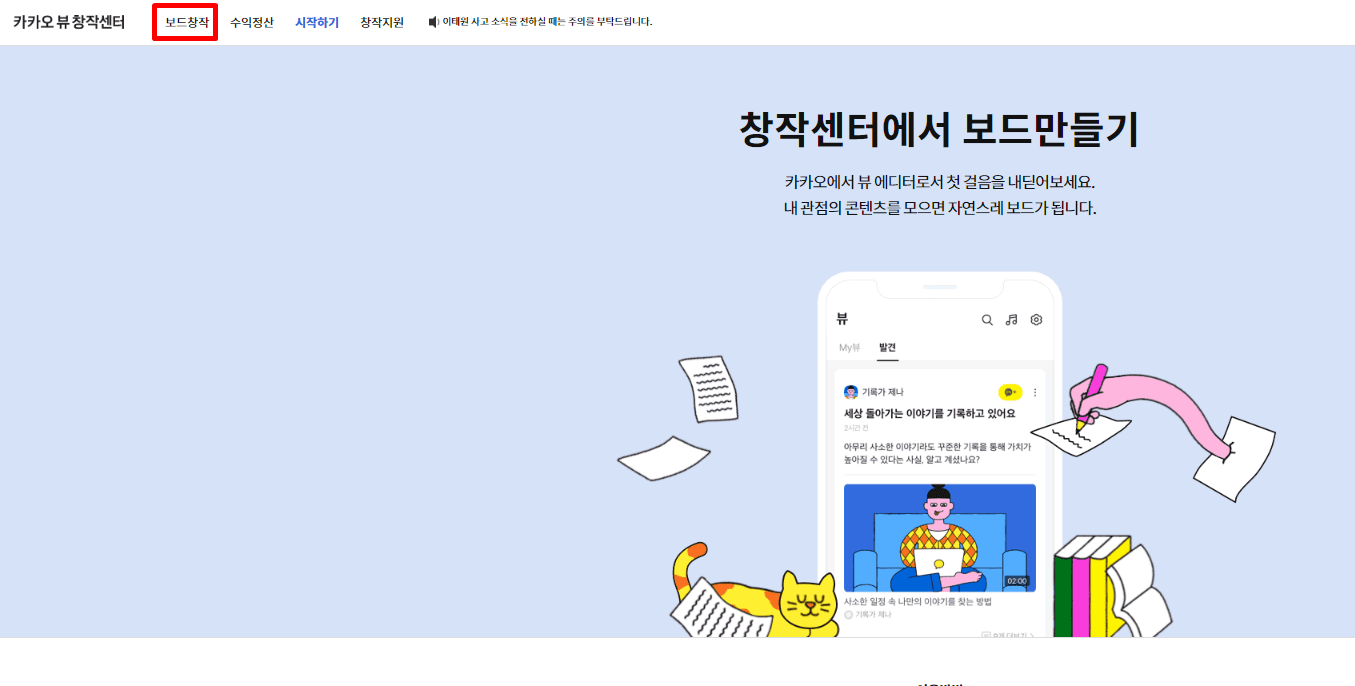 카카오 뷰 창작센터 접속하기 로그인을 하시고 왼쪽 창착센터 시작하기를 클릭하여 메인 화면으로 들어가면 됩니다. 왼쪽 상단 보드창작을 클릭하시고 채널 만들기를 눌러 채널을 생성하면 됩니다.