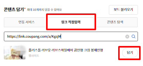 2. 오른쪽 상단에 링크 직접입력을 클릭하고 입력란에 내가 만든 쿠팡 파트너스 URL을 붙여 넣기 한다. 그러면 아래와 같이 내가 팔고자 하는 물품이 나오게 되고 담기를 클릭하면 된다.