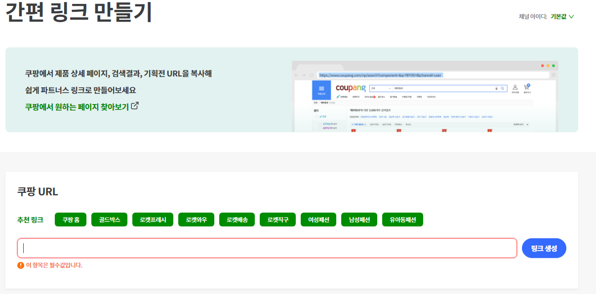 3. 쿠팡 사이트에 접속해서 내가 팔고 싶은 물품을 검색하고 상품의 URL을 복사를 하고 쿠팡 파트너스 링크 생성에 붙여 넣기하고 링크 생성을 클릭한다.