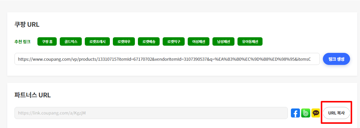 4. 링크를 생성하면 파트너스 URL이 생성되고 URL을 복사를 해서 내가 홍보하고 싶은 곳에 홍보를 하면 됩니다. URL 복사 옆에 페이스 북, 밴드, 카카오 톡 버튼이 있는데 이곳을 통해 홍보를 해도 된다.