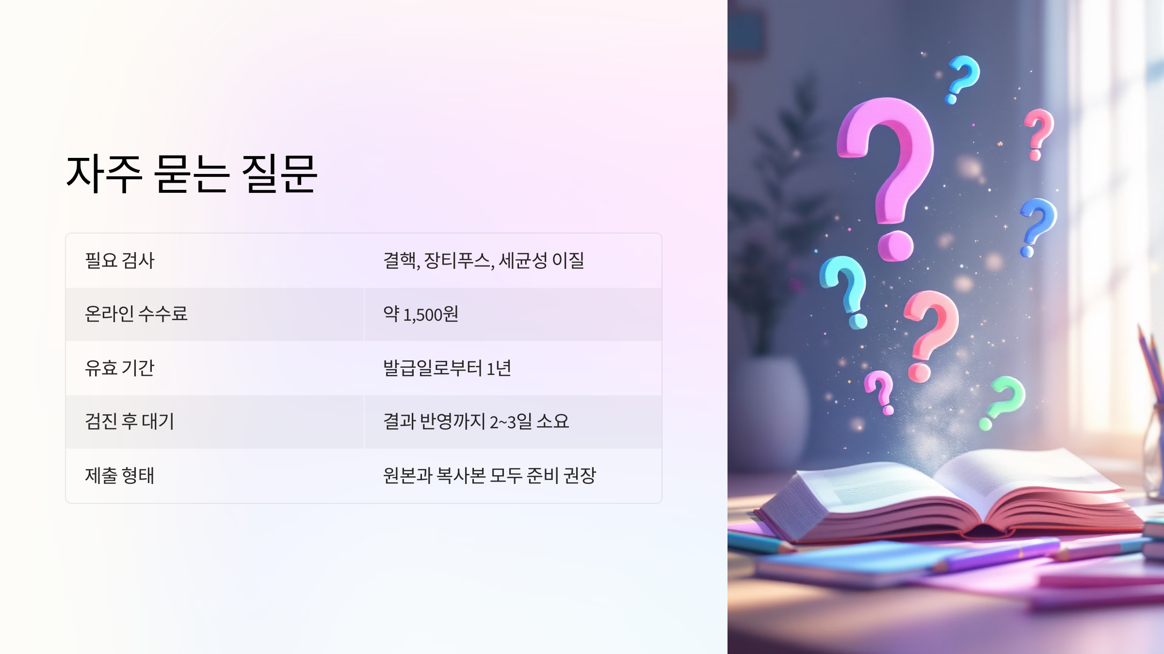 보건소에서의 검진 비용은 보통 지역에 따라 약간의 차이가 있으나, 일반적으로 3,000원에서 5,000원 정도의 비용이 발생합니다. 검진 후 결과가 등록되기까지는 평균 2~3일이 소요되며, 결과가 시스템에 등록된 후부터 온라인 발급 절차를 진행할 수 있습니다. 따라서 빠르게 보건증을 발급받기 위해서는 사전에 검진 시간을 고려하고, 여유 있게 검진을 받는 것이 좋습니다.