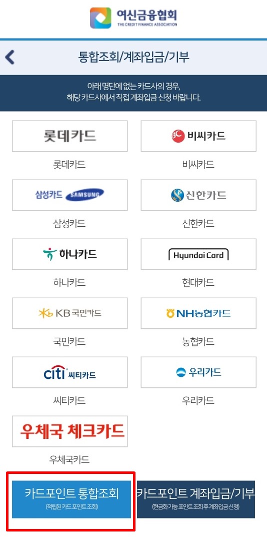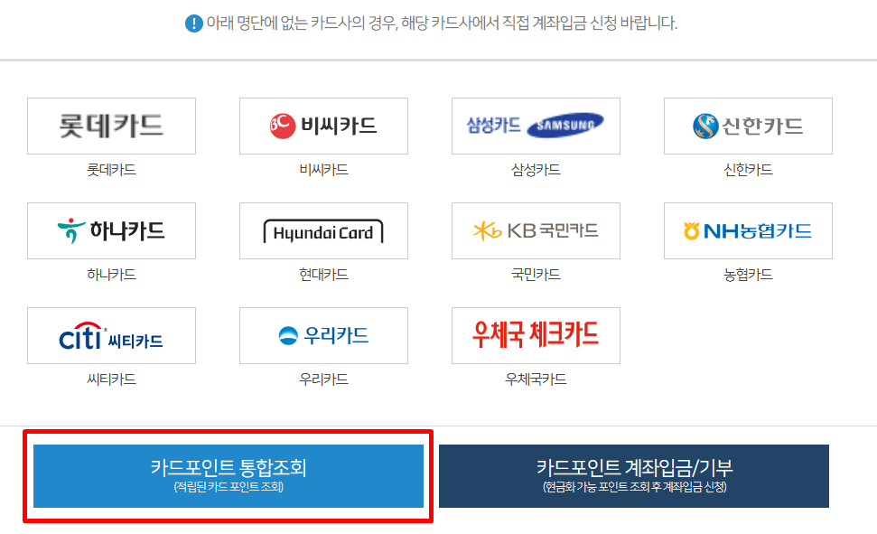 3. 많은 카드사에 카테고리가 나오지만 왼쪽 하단에 있는 카드포인트 통합조회를 눌러 다음 페이지로 넘어가시면 됩니다.