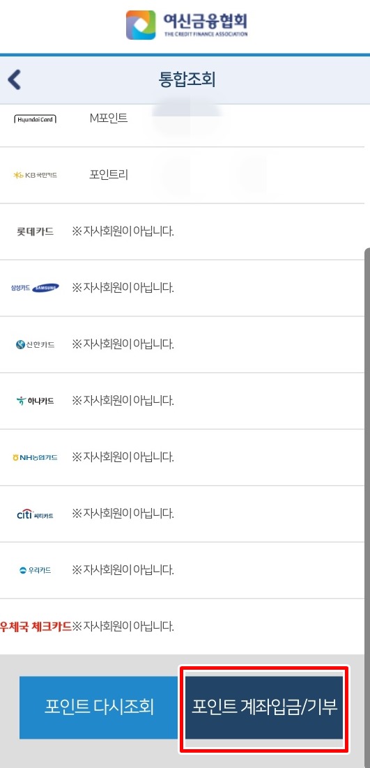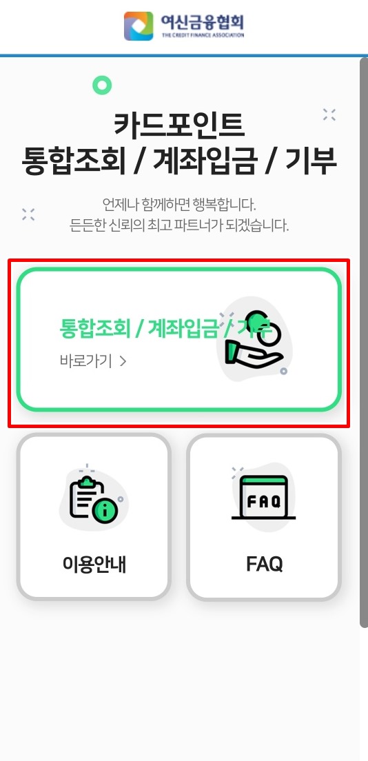 1. 스마트 폰으로 여신 금융 협회 카드 포인트를 입력하고 어플을 다운로드하고 통합조회/ 계좌입금/ 기부 바로가기 터치합니다. 그리고 회원/ 비회원을 선택하여 로그인합니다