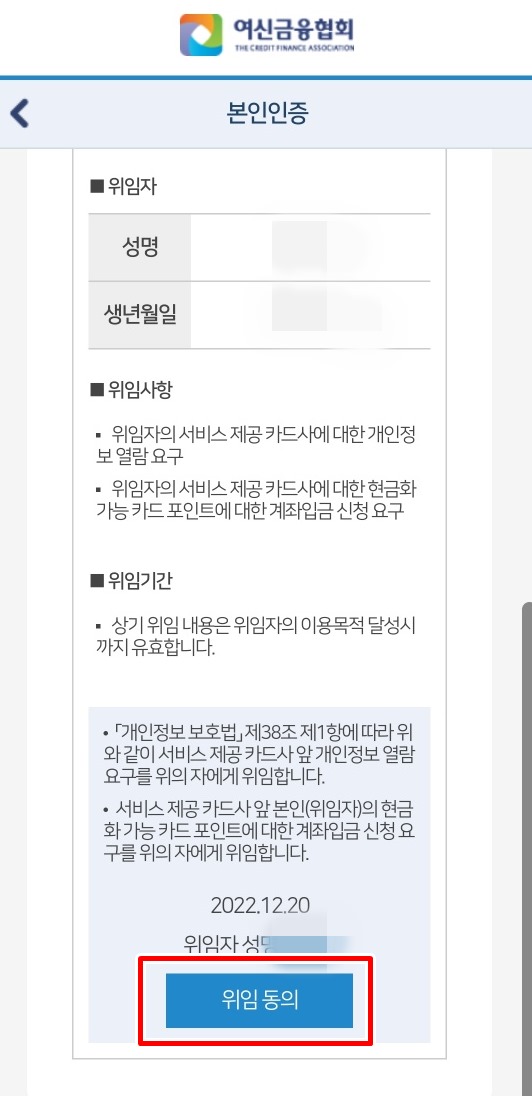 3. 위임 동의를 터치하고 카드 포인트 통합조회를 터치한다.
