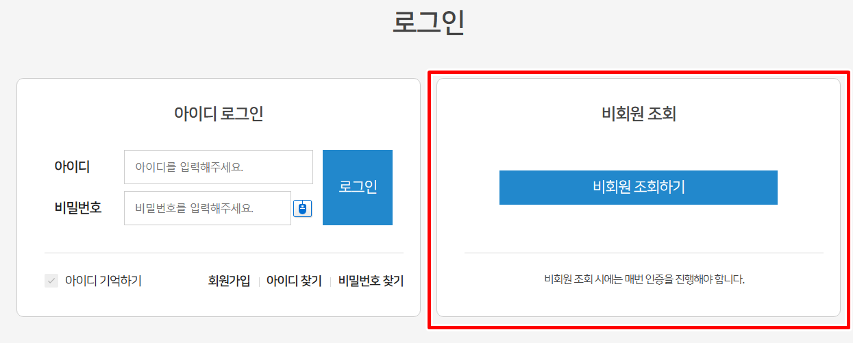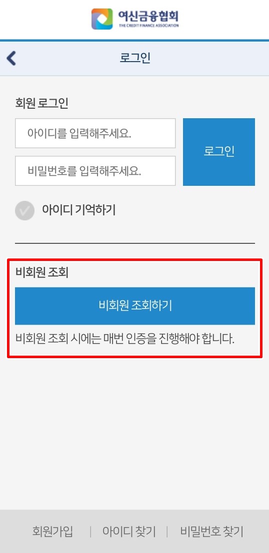 2. 여신금융협회 회원이신 분은 아이디 비밀번호를 입력하시고 로그인하시면 되고 비회원은 본인인증을 하여 로그인하시면 됩니다.