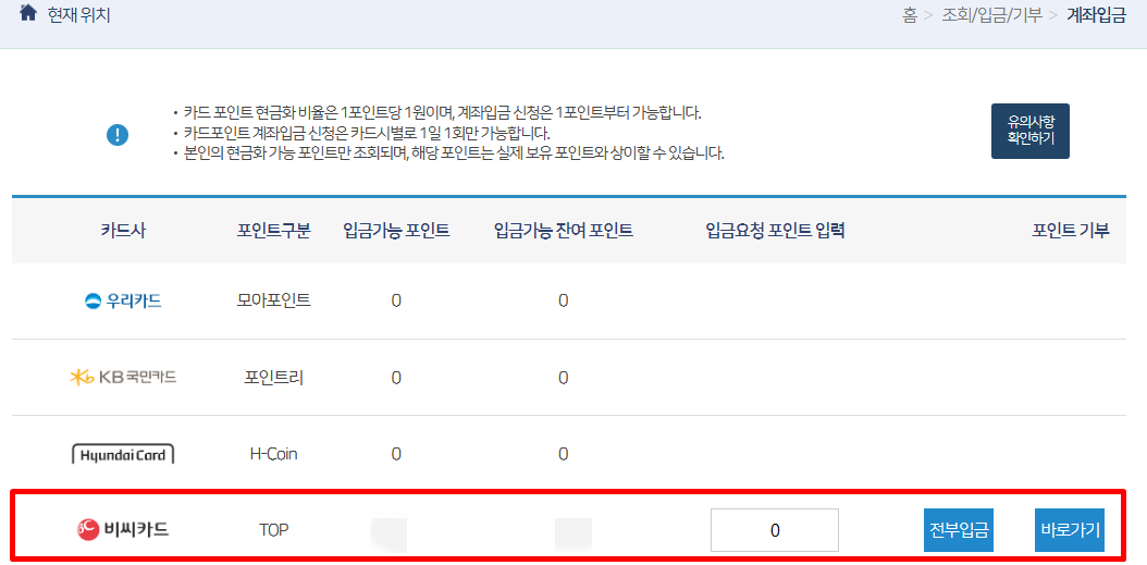 5. 카드 포인트 금액 입력란에 입력하고 통장으로 현금받아보시면 됩니다.