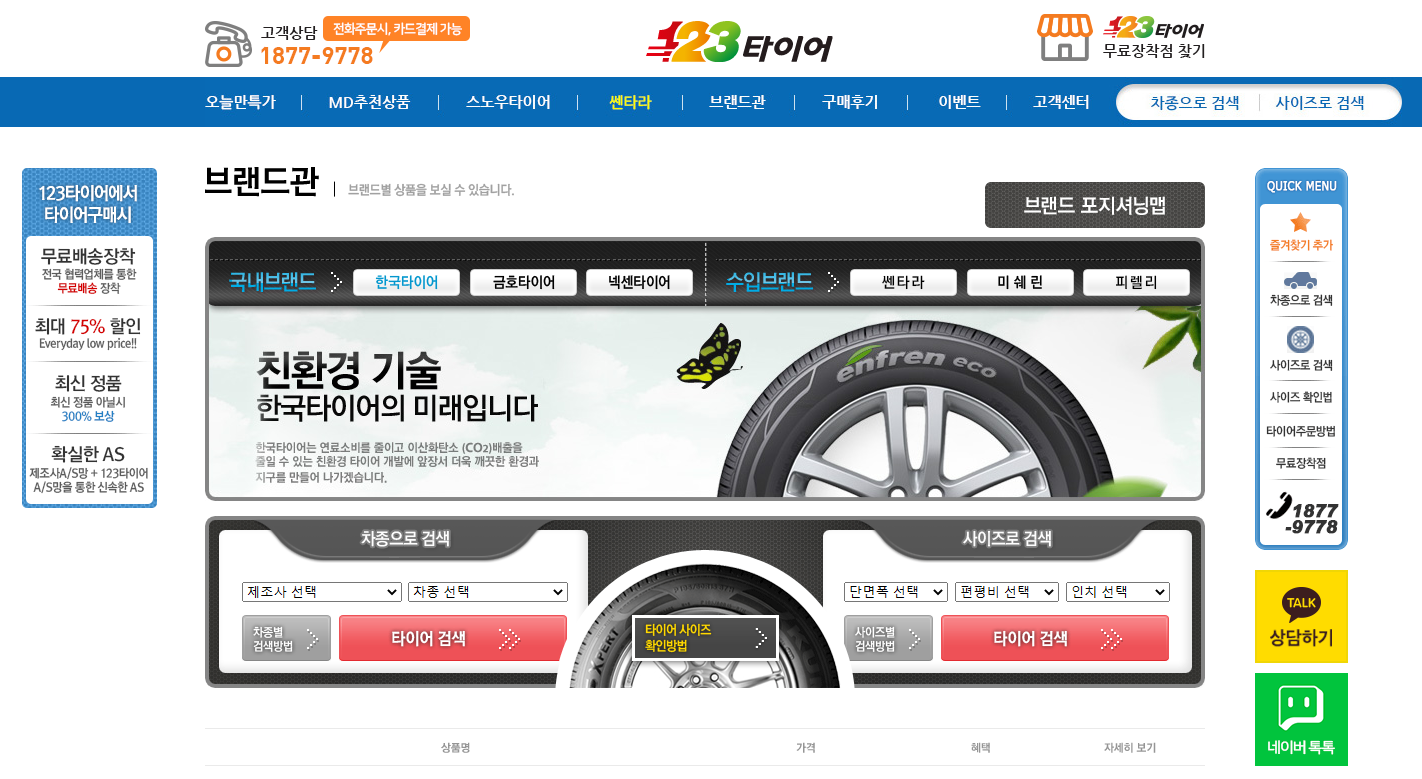 타이어 123은 타이어 픽에 비해 조금은 복잡한 메인 화면을 가지고 있습니다. 하지만 전면에 보이는 여러 카테고리 중 선택하여 쉽게 타이어를 보실 수 있고 내 차종을 선택하여 거기에 맞는 타이어를 선택하시면 됩니다. 타이어 123의 타이어 검색 방법은 제조사 차종을 검색하여 해당 타이어 스펙을 확인 후 브랜드를 선택해 타이어를 구매하는 방식과 타이어 사이즈를 입력해서 구매하는 방식이 있습니다. 두 곳 다 직관으로 잘 나와있어 타이어 가격 비교하는 것은 손쉽게 하실 수 있습니다. 타이어 123도 인터넷을 타이어를 구매하시고 장착서비스를 신청할 경우 무료로 배송을 하고 있어 장착점에 가서 편하게 장착하면 됩니다.