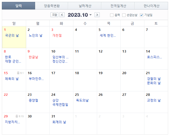 9월 10월에는 휴일이 꽤나 많습니다. 9월에 추석 연휴가 9월 28일부터 10월 1까지 총 4일 연휴로 되어있습니다. 그러고 나서 바로 이틀 뒤인 3일 날 개천절이 있어 10월 2일만 휴가를 내신다면 6일간 긴 연휴를 보내실 수 있습니다. 그리고 그다음 주 9일 한글날도 있어 9월 28일부터 10월 9일 한글날까지는 쉬는 날이 많겠습니다.