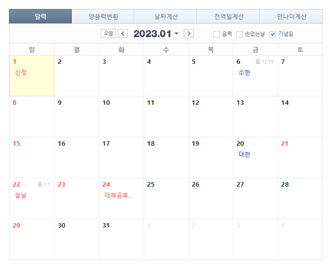 올 설날은 1월 21일부터 대처 공휴일을 포함해 1월 24일까지 설 연휴가 되겠습니다. 21일 전날은 20일이 금요일이라 금요일부터 설 연휴가 시작된다고 보시면 되겠습니다. 2월은 정월 대보름이 2월 5일 일요일이라 조금은 아쉬운 달이 되겠습니다.