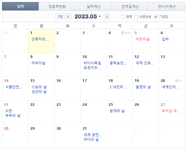 5월에는 5월 1일 근로자의 날이 월요일에 있어 토일월 3일간 연휴기간이며, 어린이날이 금요일에 있어 금토일 3일간 연휴가 되겠습니다. 3월 4월 많이 못 쉬어서 5월에 있는 연휴는 꿀맛 같은 휴일 이겠습니다. 5월 27일 부처님 오신 날은 토요일이라 조금은 아쉬운 공휴일이 되겠습니다. 그리고 6월에는 6월 6일 현충일이 화요일에 있어 토요일일 일요일 쉬시고 월요일 하루만 일을 하시면 하루 더 쉬는 날이 옵니다. 이때 많은 직장인 분들께서는 월요일에 월차나 연차를 써서 길게 쉬실 수 있겠습니다.