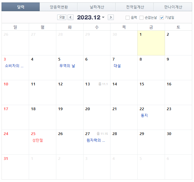 9월 10월에 많이 쉬셨으니깐 11월 12월에는 열심히 일하셔야겠죠? 11월은 공휴일이 따로 없고 12월 25일 크리스마스가 월요일에 있어 토일월 3일간 쉬실 수 있습니다. 2023년 생각보다 많은 휴일에 조금 놀라셨죠? 2023년 달력을 보면서 계획을 잘 짜 보시고 내년 한 해도 멋진 날들로 만드시면 됩니다!!