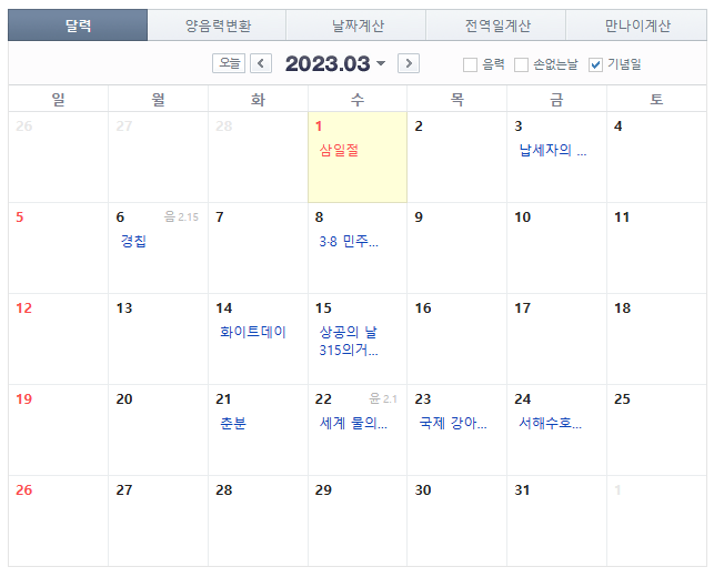 새 학기가 시작되기 전 3월 1일 삼일절이 3월 첫째 주 수요일입니다. 삼일절 공휴일을 지내고 4월까지는 특별한 공휴일 없이 열심히 일을 하셔서 다음 휴일 때 즐거운 시간을 보내실 수 있게 돈을 많이 버시면 되겠습니다.
